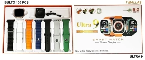 Smart Watch Ultra 9: Tecnología y Versatilidad en tu Muñeca El Smart Watch Ultra 9 te permite hacer y recibir llamadas con total facilidad gracias a su pantalla touch completa que facilita la navegación. Incluye 7 mallas intercambiables para personalizar tu estilo según la ocasión. Este modelo es ideal para quienes buscan funcionalidad y diseño en un solo dispositivo. Se comercializa en bultos de 50 unidades